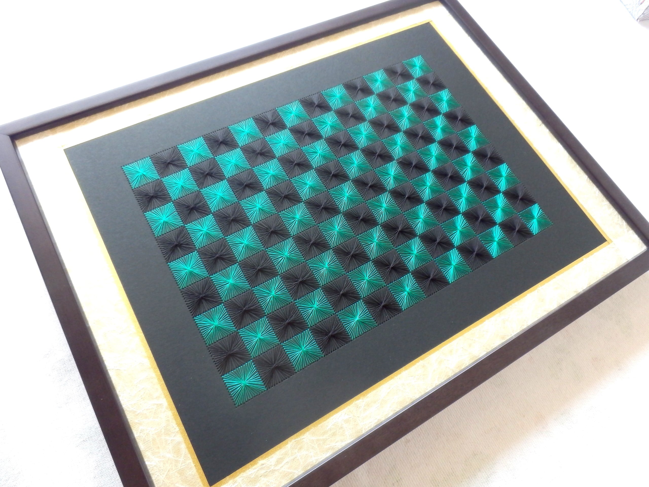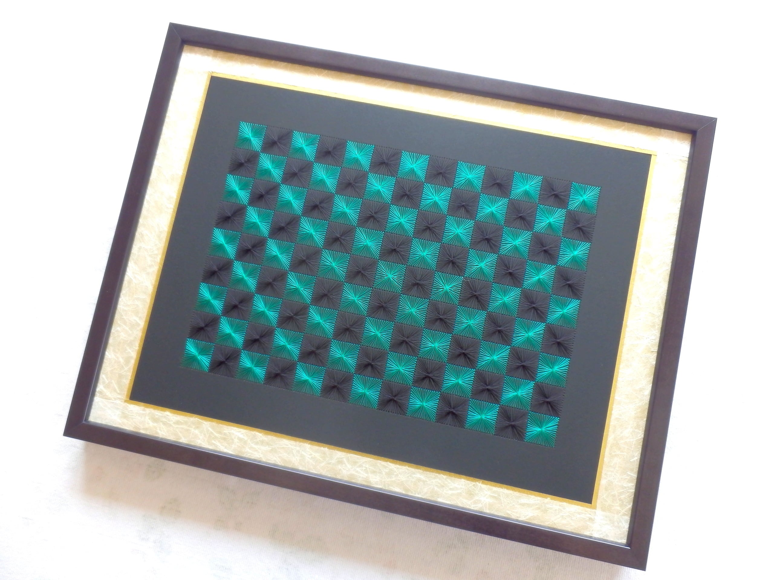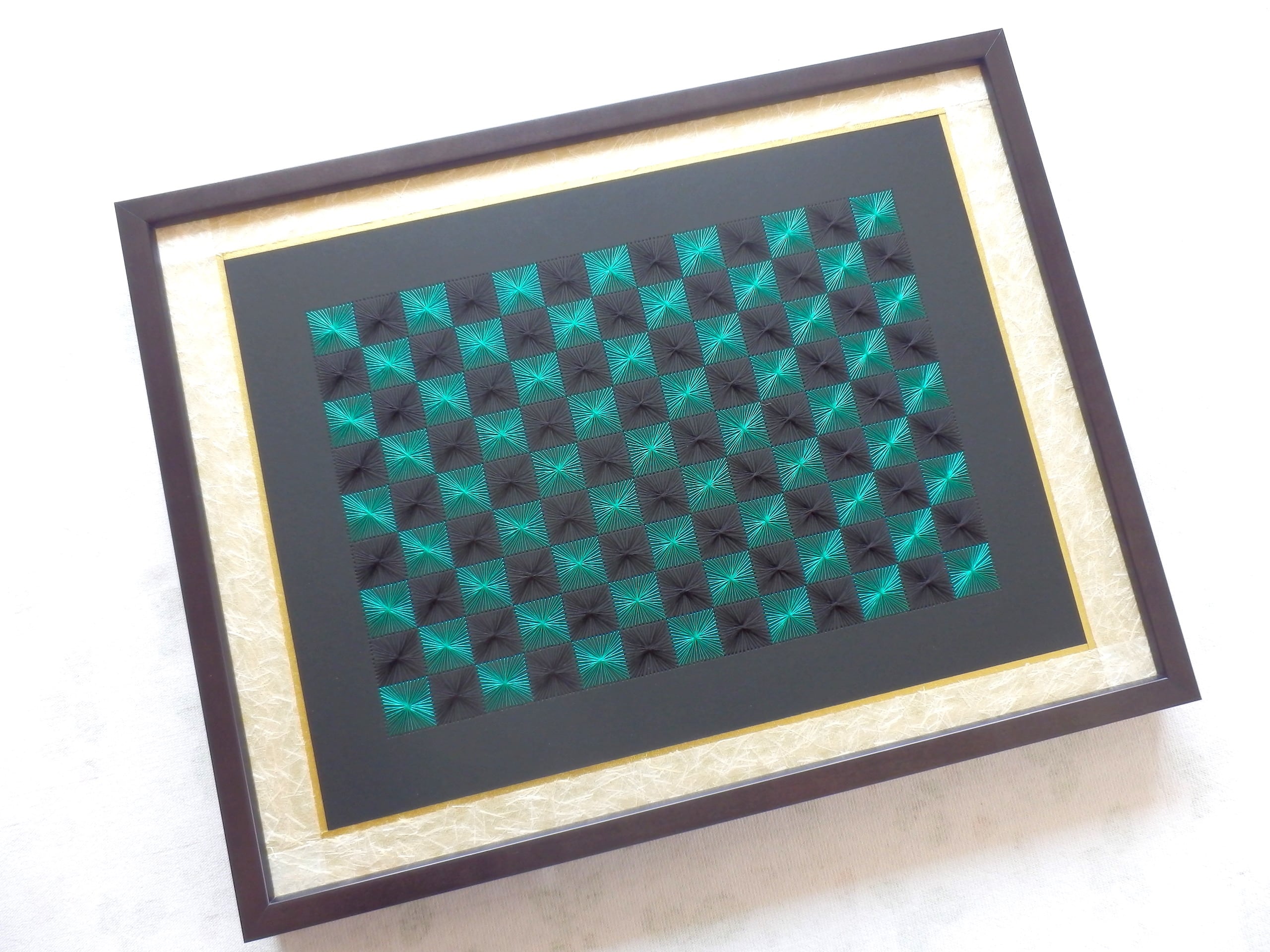 現代の流行色の絹糸を使って、市松模様を糸とおしで表現しました。