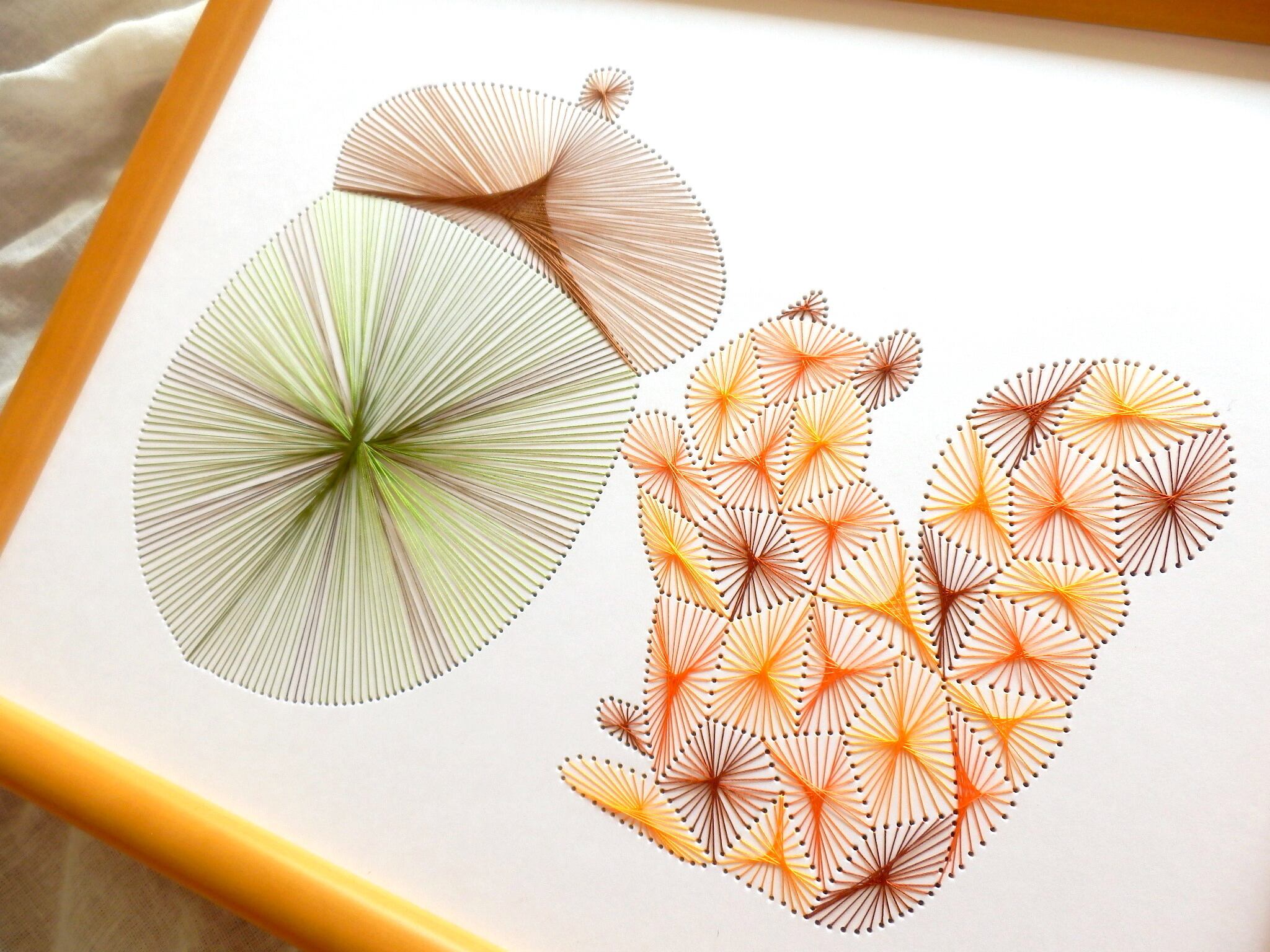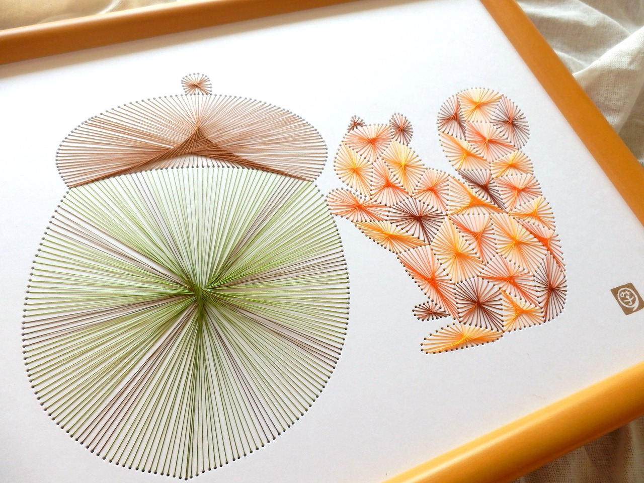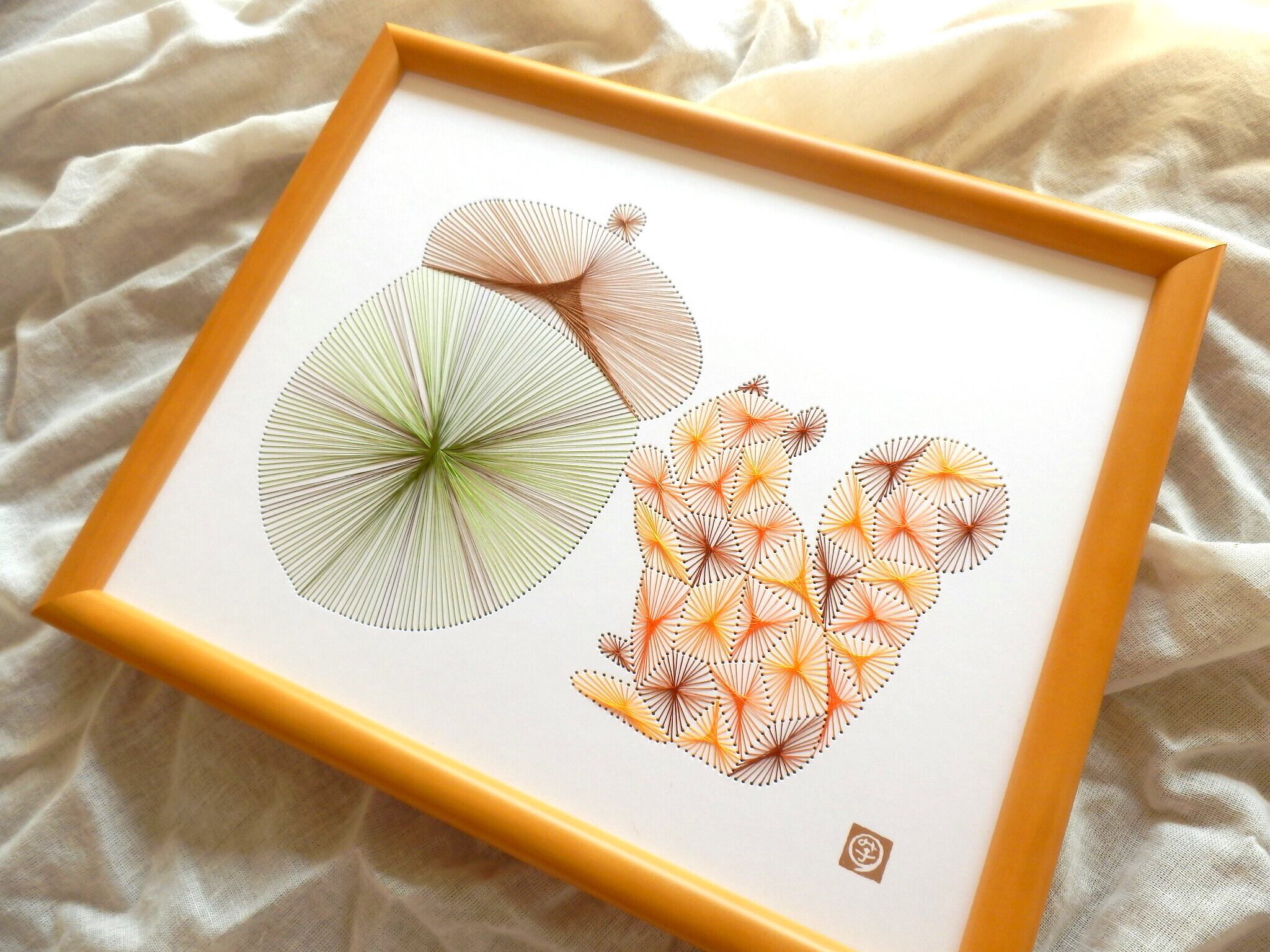 秋をテーマに大きなどんぐりとそれを支えるリスを糸とおしで作りました。